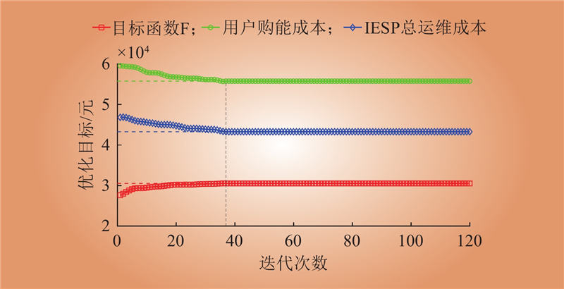 | 场景 | 优化 方法 | 用户购能 成本/元 | 园区1 利润/元 | 园区2 利润/元 | 园区3 利润/元 | 需求响应 补偿/元 | 集中风电 场利润/元 | 储能电站 利润/元 | IESP向配电 网购售电 利润/元 | 弃风弃光 惩罚/元 | 购气成本/ 元 | IESP总成 本/元 | IESP总利 润/元 | |||||||||||||