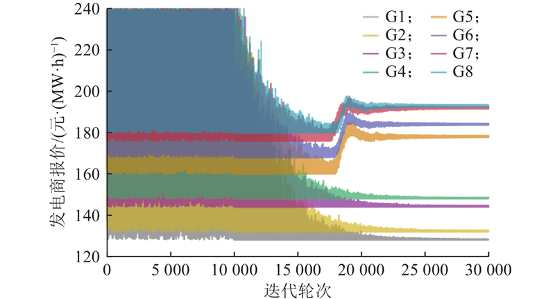 为研究中长期市场交易对现货市场运行的影响,分析发电商在现货市场中的报价策略,提出一种模拟电力现货市场发电商竞价均衡的双层优化模型和多智能体深度强化学习(multi-agent deep reinforcement learning,MADRL)求解算法。引入供需比表征现货市场供需关系,并使用前景理论刻画发电商的有限理性行为特征,以此分析中长期市场交易对现货市场中发电商报价策略的影响。在MADRL求解过程中,将发电商建模为智能体,现货市场出清建模为环境,通过迭代求解得到均衡状态下各发电商的报价策略和现货市场出清价格。以中国东部区域包含8家发电商的实际电力系统为例开展仿真,结果表明,该MADRL算法可以有效求解各发电商的报价策略,准确模拟不同中长期市场设置对现货市场运行的影响。研究结论可为电力交易机构评估发电商竞价行为和制定市场规则提供参考依据。